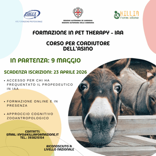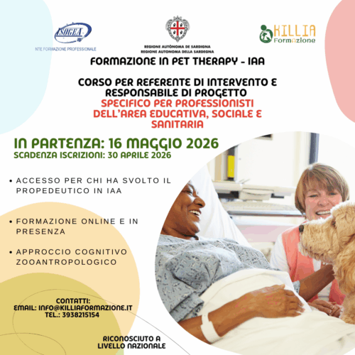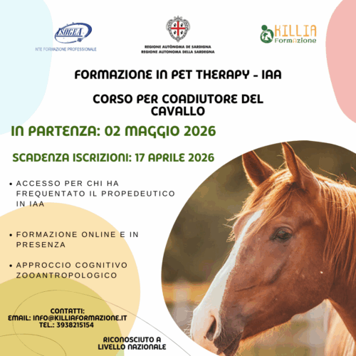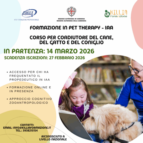 🐾 In partenza il Corso Propedeutico in Pet Therapy a Cagliari La Cooperativa Sociale Killia, da anni attiva negli Interventi Assistiti con Animali (IAA), presenta il Corso Propedeutico in Pet Therapy, riconosciuto ai sensi dell’Accordo Stato-Regioni 60/CSR del 25 marzo 2015 e della normativa regionale vigente. 👉 Il percorso formativo rappresenta il primo step obbligatorio…